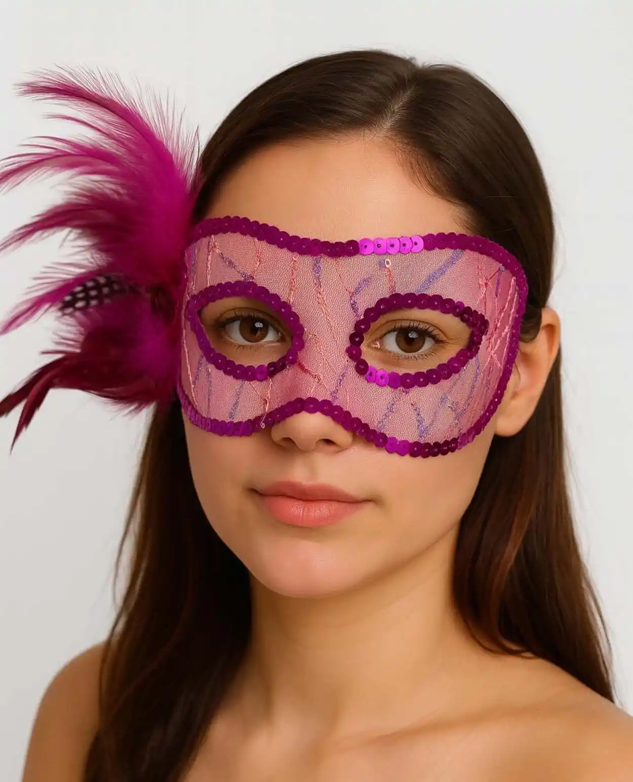 Fuşya Renk Yandan Tüylü Pul Payet İşlemeli Parti Maskesi 23x12 cm
