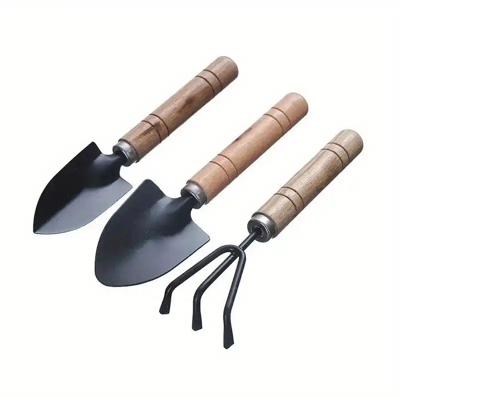 3 parça mini bahçe alet seti, tohum ekmek, sukulentler ve saksı malzemeleri için ahşap saplı çiçek tırmığı ve küçük kürek.
