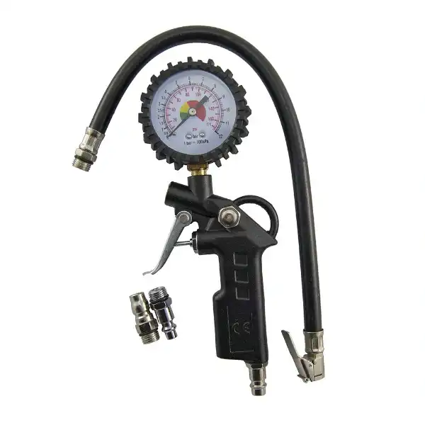 SAATLİ HAVA TABANCASIÜrün ÖzellikleriSaatli hava tabancası, araç lastiklerinin hava basıncını ölçmek ve doğru seviyeye getirmek için profesyonel bir çözümdür. Üzerinde bulunan hassas manometre sayesinde lastik basıncı bar ve psi cinsinden kolayca takip edilebilir. 0-8.5 bar / 0-120 psi ölçüm kapasitesine sahiptir.500 mm hortum uzunluğu ile kullanımda esneklik sağlar. Dayanıklı metal gövdesi ve ergonomik tetiği sayesinde uzun süreli kullanımlarda konfor sunar. Hızlı ve güvenilir hava dolumu için tasarlanmış bu ürün, hem profesyonel servislerde hem de kişisel araç bakımında ideal bir yardımcıdır.Paket İçeriği1 adet saatli hava tabancası