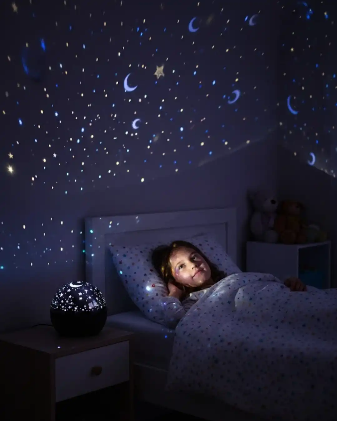 Yıldız projektör gece lambası, fişe takılarak çalışan yapısıyla güvenli ve sürekli kullanım sunar. Elektrik bağlantısı sayesinde ışık gücü sabit kalır ve uzun süreli kullanımlarda performans kaybı yaşanmaz. Özellikle çocuk odalarında gece lambası olarak tercih edilebilir.Tavan ve duvarlara yansıyan yıldız desenleri, ortama sakinleştirici bir hava katar. Parlaklık ve hız ayarları sayesinde istenilen atmosfer kolayca oluşturulabilir. Dahili hoparlörü sayesinde müzik veya rahatlatıcı sesler eşliğinde kullanılabilir.Sesle tepki veren ışık modu, müziğin temposuna uyum sağlayarak görsel bir şölen oluşturur. 30 dakikalık otomatik kapanma özelliği ise gece kullanımında pratiklik sağlar. Şık ve kompakt tasarımı sayesinde her ortama uyum sağlar.