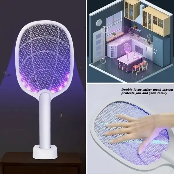 ŞARJLI STANDLI SİNEK ÖLDÜRÜCÜ RAKETÜrün ÖzellikleriŞarjlı standlı sinek öldürücü raket, 5W güçlü performansı ve UV mor ışık teknolojisi sayesinde sinek ve uçan böcekleri hızlı ve etkili şekilde yakalamak için tasarlanmıştır. UV mor ışık, sivrisinekleri ve haşereleri kendine çekerken yüksek voltajlı tel örgü temasıyla anında etkisiz hale getirir. Şarj edilebilir bataryası sayesinde kabloya ihtiyaç duymadan ev içinde ve dış mekânlarda rahatça kullanılabilir. Masaüstü standı ile sabit kullanım imkânı sunarken, el tipi yapısı sayesinde taşınabilir olarak da kullanılabilir. Hafif ve ergonomik tasarımı uzun süreli kullanımlarda bile konfor sağlar. Sessiz ve gürültüsüz çalışma özelliği sayesinde gece kullanımına uygundur. Kimyasal içermeyen yapısı ile çevre dostu ve güvenli bir sinek kontrol çözümü sunar. Ev, ofis, balkon, bahçe ve kamp alanlarında pratik ve etkili kullanım için idealdir.Paket İçeriği1 adet şarjlı sinek öldürücü raket