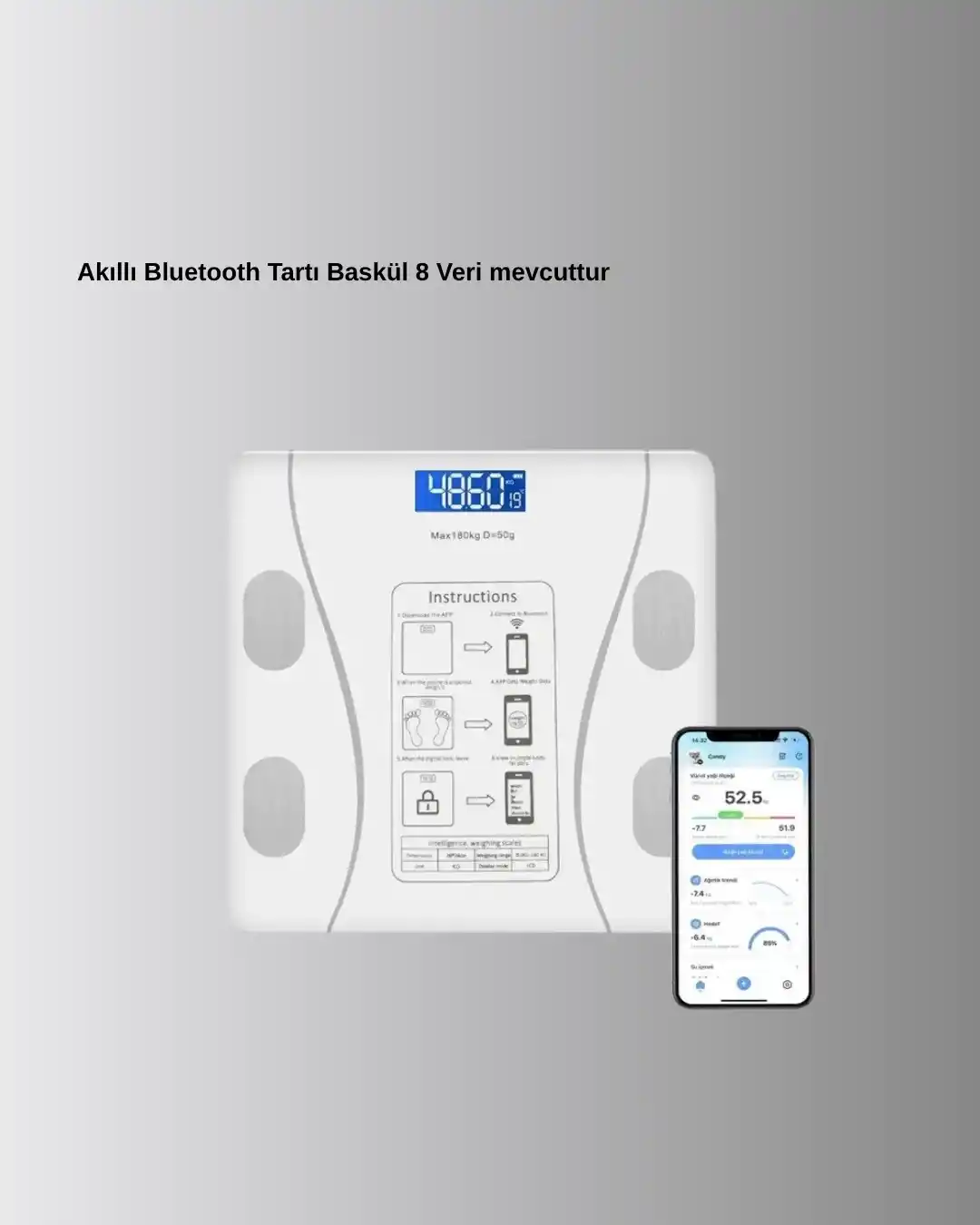 • Akıllı Dijital Baskül – Bluetooth Bağlantılı, 8 Ölçüm Verili, Akıllı Vücut Analiz Tartısı