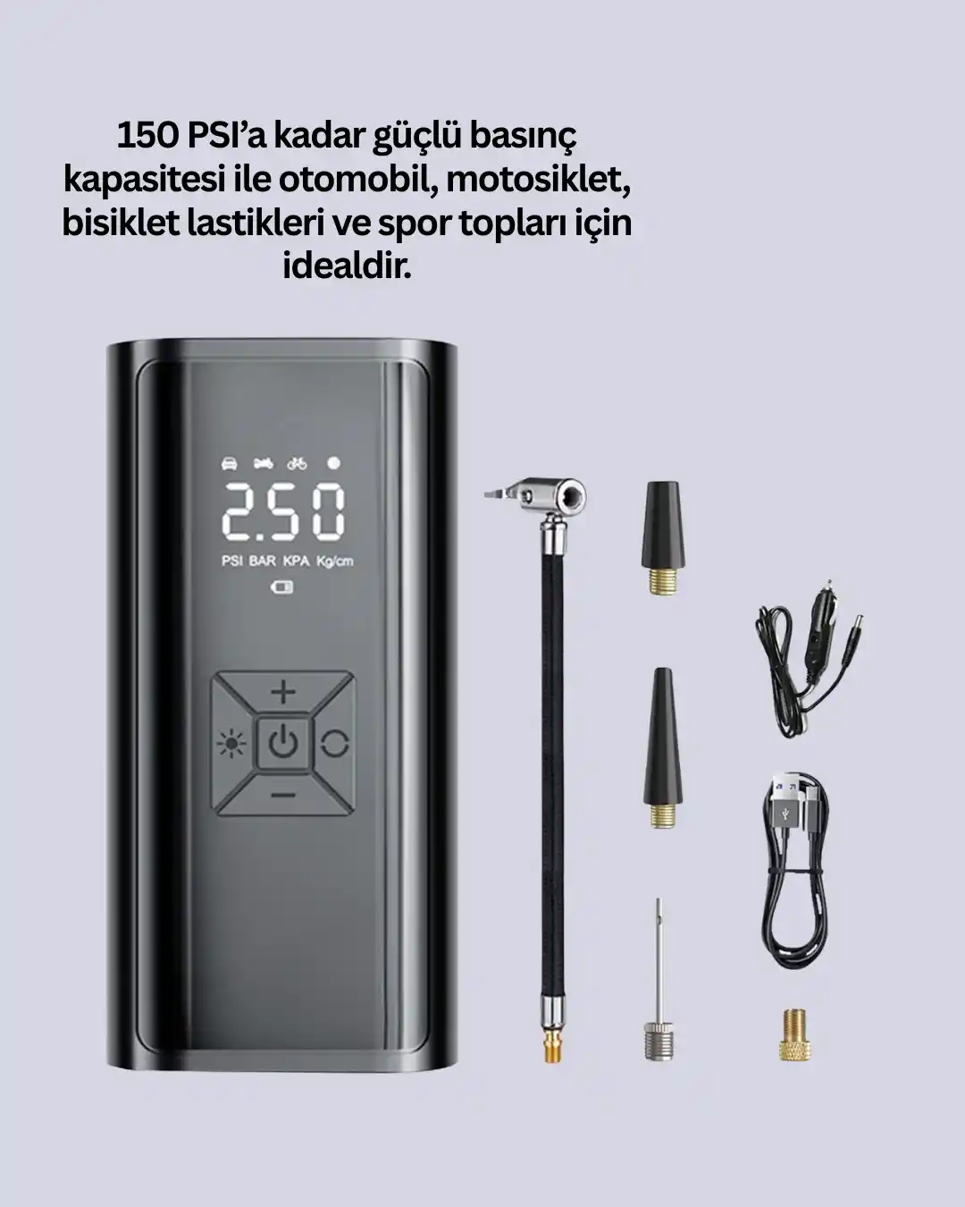 Dijital yükseltilmiş sürümüyle öne çıkan bu taşınabilir lastik pompası, güçlü performansı ve çok işlevliliği bir arada sunar. 80W motoru ile lastikleri hızlıca şişirir. Arabalar, elektrikli araçlar, bisikletler ve toplar için farklı modları mevcuttur.Kablosuz şişirme teknolojisi sayesinde ekstra kabloya gerek duymazsınız. Kompakt boyutu ile kolay taşınabilir, aracınızda yer kaplamaz. Dört katmanlı güçlendirilmiş tasarımı sayesinde sağlam ve uzun ömürlüdür.Dijital ekranı, basınç değerlerini net şekilde görmenizi sağlar. Önceden basınç ayarı yak güvenli kullanım elde edebilirsiniz. LED lamba fonksiyonu gece kullanımında kolaylık sağlarken, SOS ışıkları acil durumlarda hayat kurtarıcı olabilir.Spor toplarından şişme yataklara kadar geniş bir kullanım alanına sahip bu cihaz, tek bir ürünle birçok ihtiyacınızı karşılar. Güçlü motoru, dayanıklı yapısı ve pratik tasarımıyla günlük yaşamda vazgeçilmez bir yardımcınızdır.