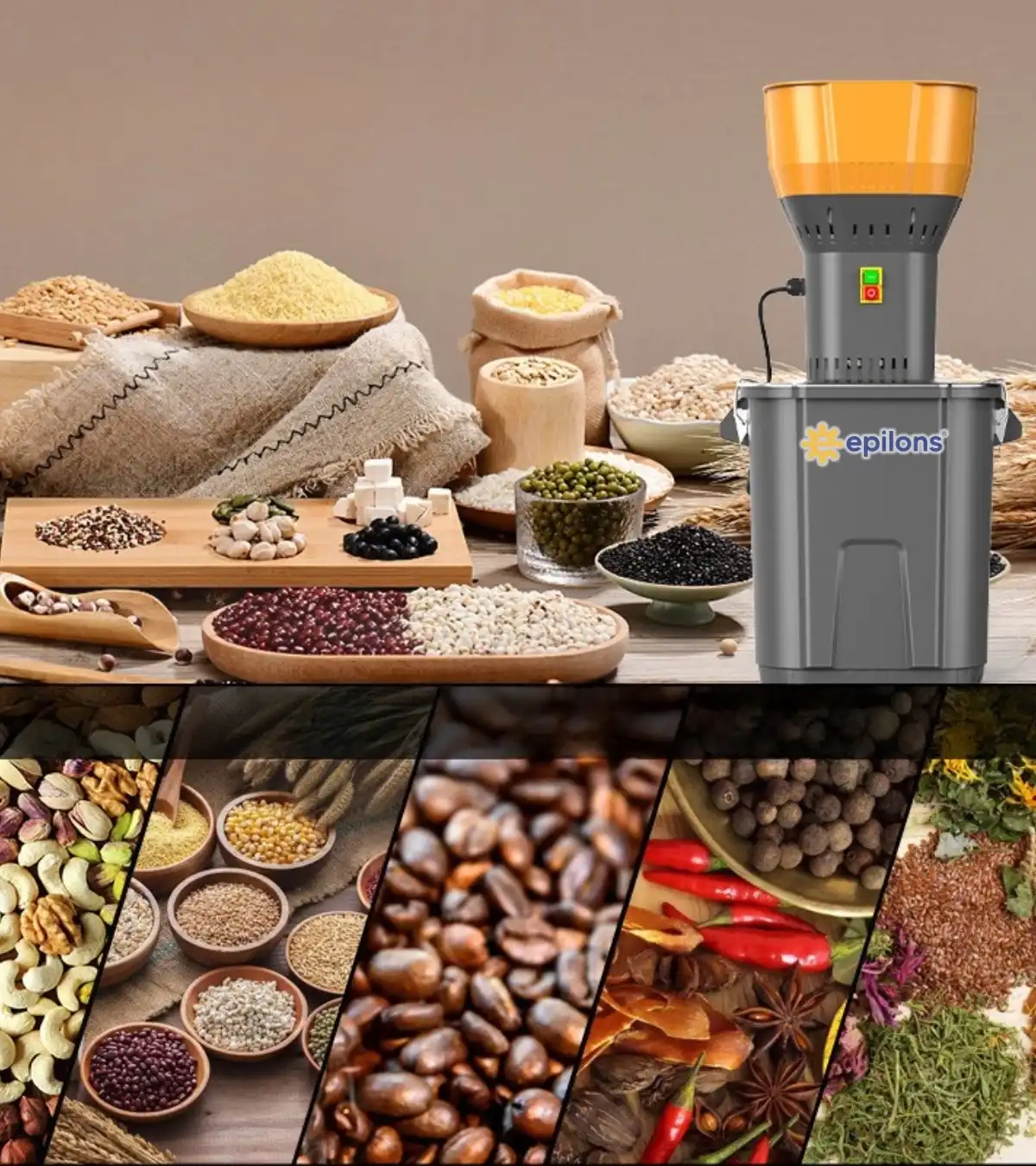 Epilons Pro 1300W Elektrikli Tahıl ve Baharat Öğütücü – 0,6–8 mm Ayarlanabilir Granül, Paslanmaz Çelik