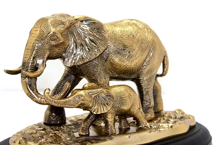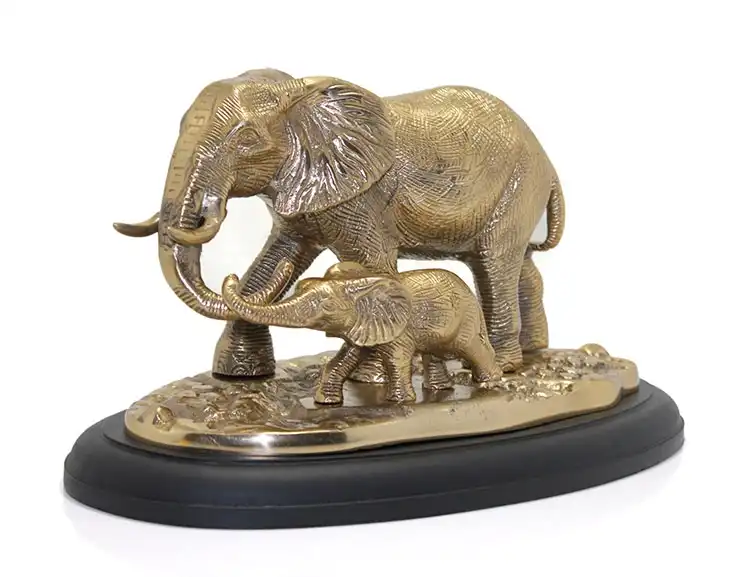 PİRİNÇ FİL BİBLOSUÜrün ÖzellikleriPirinç malzemeden üretilmiş bu zarif fil bibloları, büyüleyici bir tasarıma sahip olup, anne ve yavru fili simgelemektedir. 35x20 cm boyutunda olan bu obje, altın rengiyle zarif bir görünüm sunar. Hem evde hem ofiste şık bir dekorasyon parçası olarak kullanılabilir. Fil figürü, sevgi ve bağlılık sembolü olarak popüler bir koleksiyonluk parça olmasının yanı sıra, hediye olarak da oldukça idealdir.Paket İçeriği1 Adet Pirinç Fil Biblosu