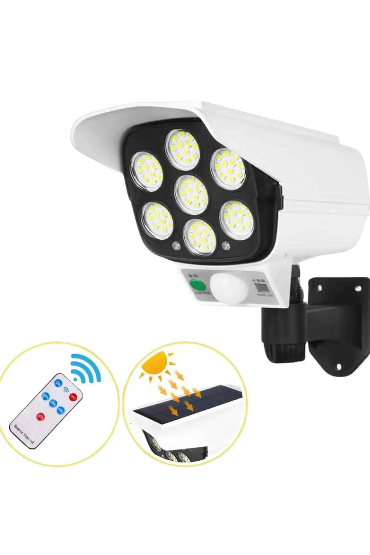 Bu güneş enerjili LED güvenlik lambası, dış mekanlarınızda hem güvenlik hem de aydınlatma ihtiyacınızı karşılayan mükemmel bir çözümdür. Yüksek verimli LED ışıkları, çevrenize güçlü bir ışık yayarak karanlık ortamlarda güvenliğinizi artırır. Gündüz güneş enerjisini depolayan polikristal silikon paneli, gece ise hareket algılandığında devreye girer ve otomatik olarak ışık yayar. Hareket sensörü, 120° algılama açısıyla 5-8 metre mesafeden hareketi tespit ederek yalnızca ihtiyaç duyulduğunda ışık sağlar. Bu sayede hem enerji tasarrufu sağlanır hem de çevreniz ışıkla donatılır.Kamera görünümüne sahip şık tasarımı, bahçenizde veya garajınızda güvenlik hissiyatı yaratırken, IP65 su geçirmez özelliği sayesinde her türlü hava koşulunda dayanıklıdır. Yağmur, kar veya şiddetli rüzgar gibi zorlu hava şartlarına karşı korumalıdır. Kumanda ile kontrol edilebilir olması, kullanım kolaylığı sağlar; açma, kapama veya ışık modlarını değiştirmek için uzaktan kumanda kullanabilirsiniz. Kablolu bağlantı gerektirmeyen bu ürün, duvar veya direk montajı ile rahatça kurulabilir. Dayanıklı ABS plastik ve alüminyum malzemeden üretilen ürün, uzun ömürlü ve çevre dostu bir çözüm sunar. Hem pratik hem de es bir güvenlik çözümü arayanlar için mükemmel bir tercihtir.