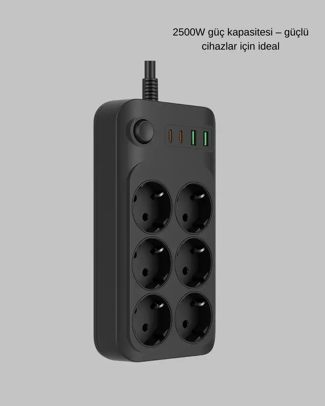 Bu termal akım korumalı 6’lı priz, güçlü cihazlarınızı aynı anda güvenli şekilde kullanmanız için tasarlanmıştır. 2500W kapasitesi sayesinde bilgisayar, TV, ses sistemi, modem, mutfak ekipmanları gibi birçok ürünü rahatça çalıştırır. USB & Type-C 2.1A çıkışları şarj adaptörü kullanmadan hızlı enerji aktarımı sağlar. Termal akım koruma teknolojisi, aşırı ısınma riskini önlerken 10A ünite voltaj dengesizliğinde koruma sunar. 2 metre kablosu, geniş alan kullanımını destekler.
