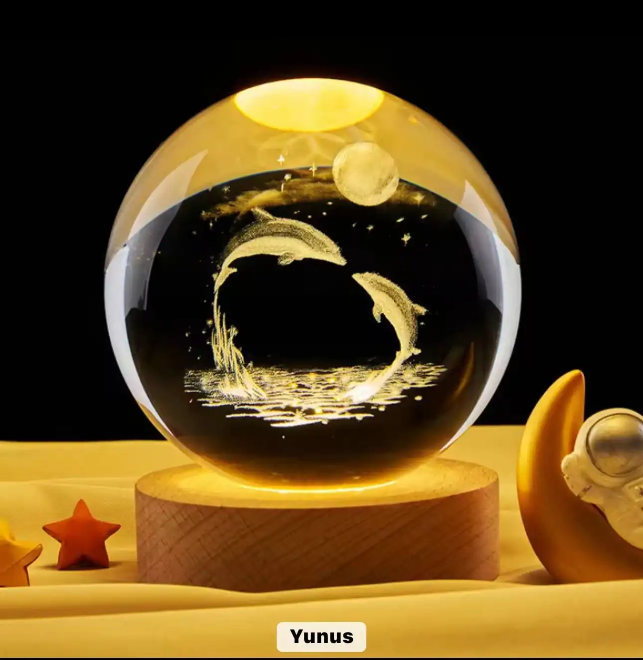 Kristal yüzeyin parlaklığı ve içindeki lazer oyma yunus deseni üstün işçilikle hazırlanmıştır. Ahşap taban, doğal dokusuyla ürünü hem dayanıklı hem de es hale getirir. Işık açıkken büyüleyici, ışık kapalıyken bile zarif bir dekoratif obje olarak kullanılabilir. Uzun ömürlü LED ışığıyla kaliteli bir kullanım deneyimi sunar.