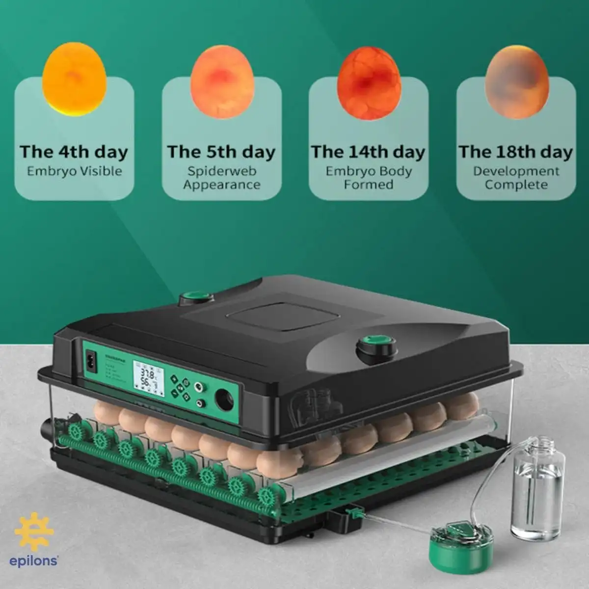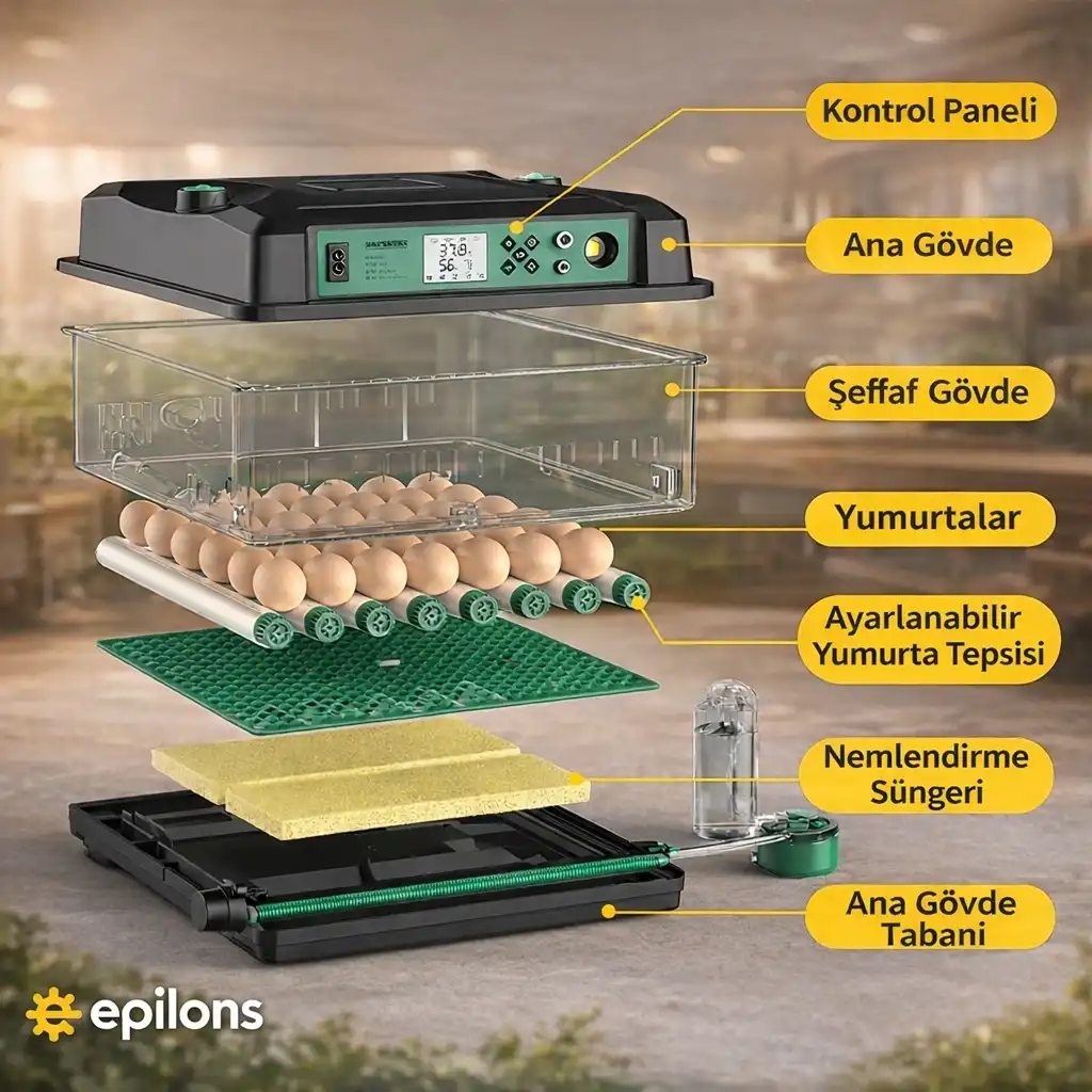 Epilons 5 hazır programlı kuluçka makinesi, yeni nesil suluk sistemli kuluçka makinesi, süngerli nem sistemi, nem tahliye kapaklı yüksek verimli sistem ve yedek motor hediyeli çift katlı kuluçka makinesi arayanlar için güçlü ve güvenilir bir tercihtir. Tavuk, kaz, hindi, ördek ve birçok kuş türü için uyumludur.